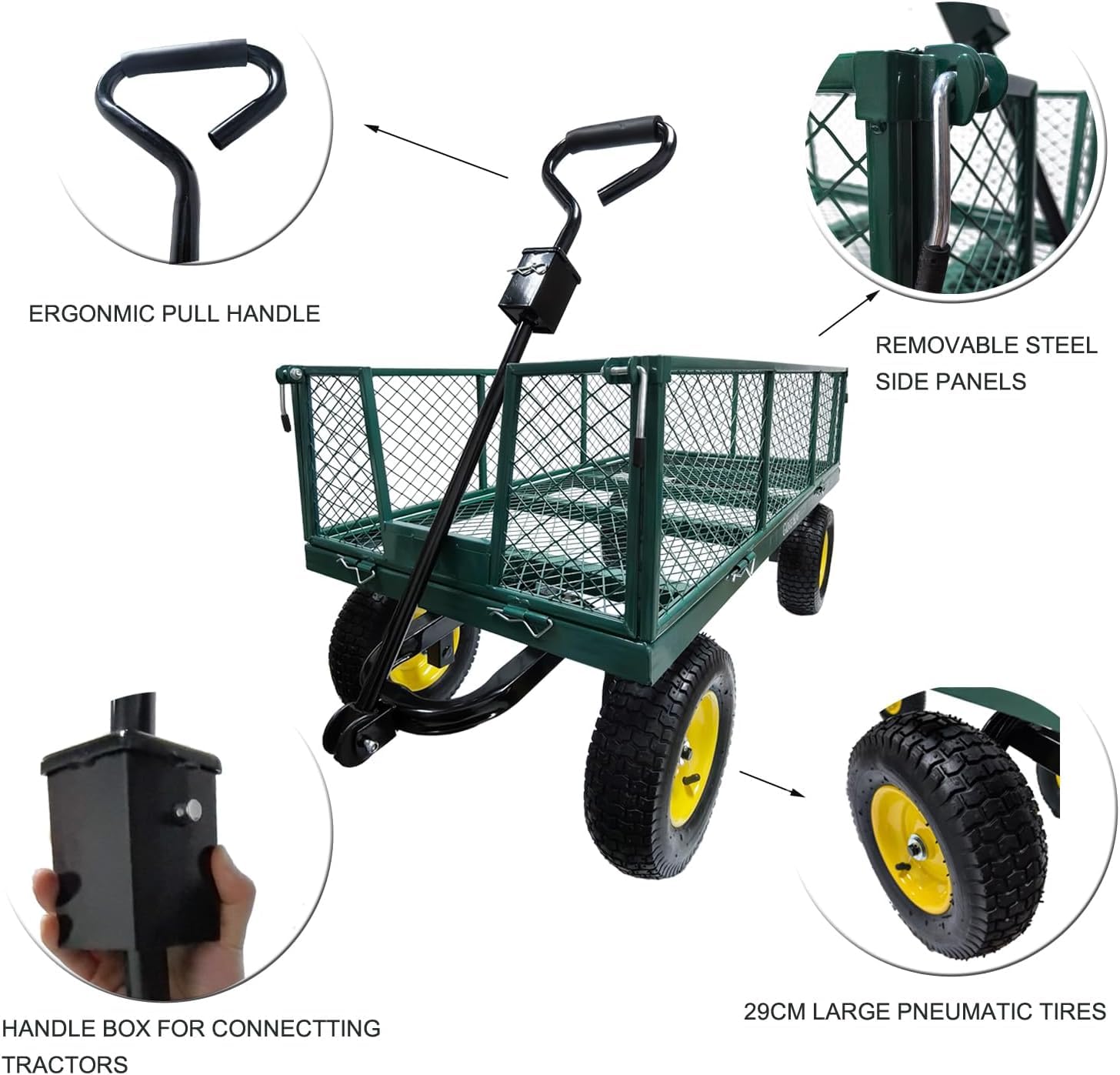 HEAVY DUTY YARD CART: Our utility yard cart offers the ultimate transportation solution with its impressive weight capacity of up to 400 kg. Whether it's loading, towing, or dumping, this cart provides ample space for all your tools and yard essentials. CONVENIENT TIPPING BUCKET DESIGN: Our pull carts feature a user-friendly dump bucket design, allowing for effortless unloading of dirt, mulch, rocks, and other items. This efficient design saves valuable time and minimizes strain on your back, providing you with ease and convenience. STURDY & DURABLE STEEL GARDEN CART: Constructed from robust powder-coated steel, our utility wagon is built to withstand the toughest of tasks in your yard. Its durability ensures long-lasting performance, making it a reliable companion for all your yard work needs. FLEXIBLE HANDLE: The handle is designed to rotate 180° and can be pulled freely and conveniently in any direction as needed. The ergonomic design makes it easy to pull even when full of goods. TRANSFORM INTO A FLATBED: With the ability to easily transform into a flatbed cart by removing the mesh sides, our lawn utility cart offers increased space and enhanced practicality. This allows you to transport various materials with ease and efficiency. NO-FLAT tyres FOR HASSLE-FREE OPERATION: Holds up to 250 kg, the steel garden cart features 10" no-flat tyres with good elasticity, impact resistance, and noise reduction, allowing you to easily navigate any terrain. yard wagon cart with pneumatic wheels can lift and move rocks, wood, boxes, equipment etc, suitable for lawn, garden, farm or hillside, ensuring that you can focus on your gardening tasks without any distractions.