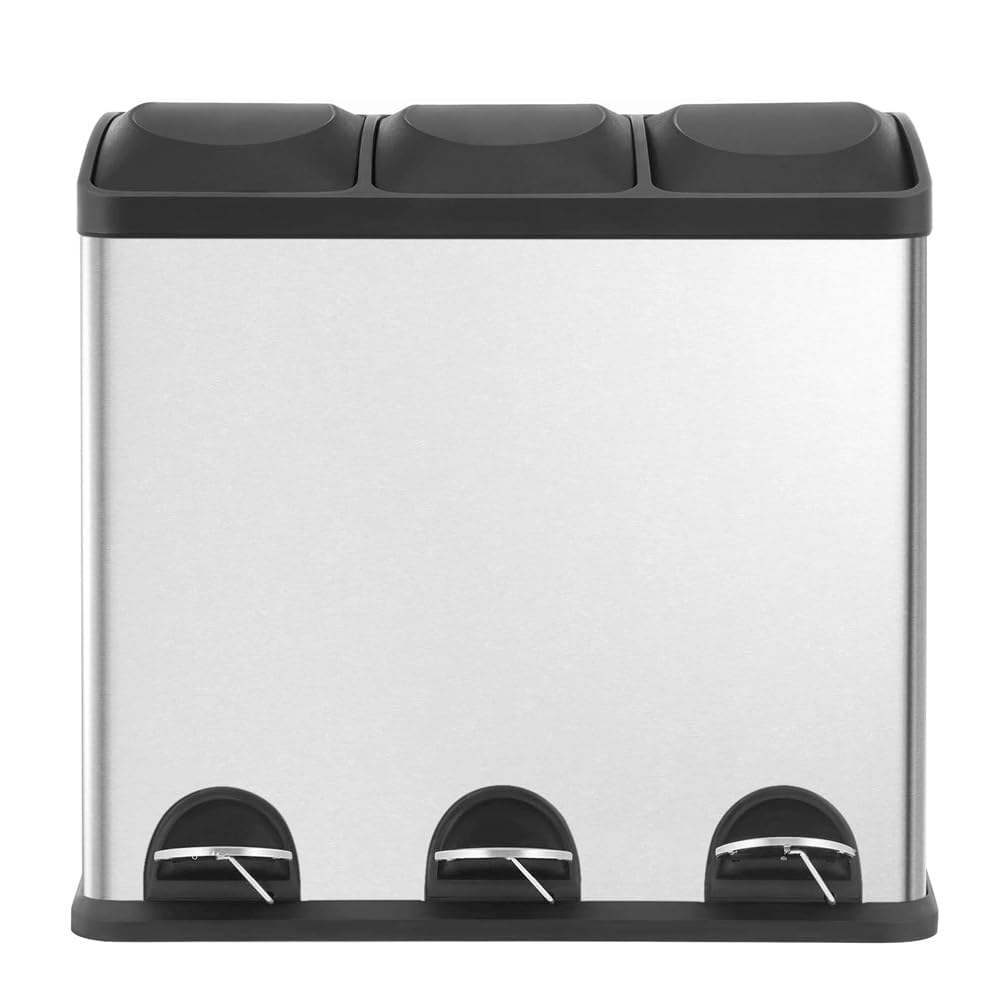 HYGRAD Kitchen Bin Recycling Bin For Kitchen Stainless Steel Triple Compartment Food Waste Bin Removable Inner Bins Kitchen Waste Compartment Bin (45L (3 x 15L Compartments))